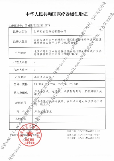 *高频手术设备属于手术类产品,其禁忌情况与所实施的电外科手术有关,设备自身并没有绝对的禁忌症。对于装有植入式心脏起搏器或其他金属植入物的患者应慎重,避免高频电流通路流经植入物附近。